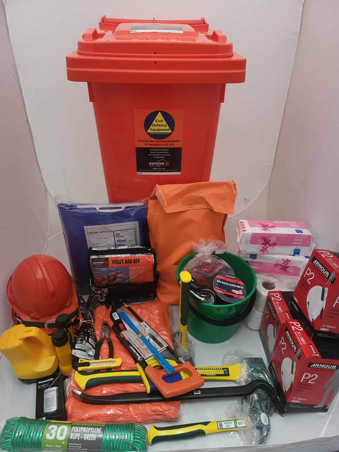 You can customise the kit to suit your needs, with options ranging from contents for 5 to 30 people. The equipment is based on the guidelines set by the Ministry of Civil Defence and Emergency Management, ensuring you’re prepared for emergencies.