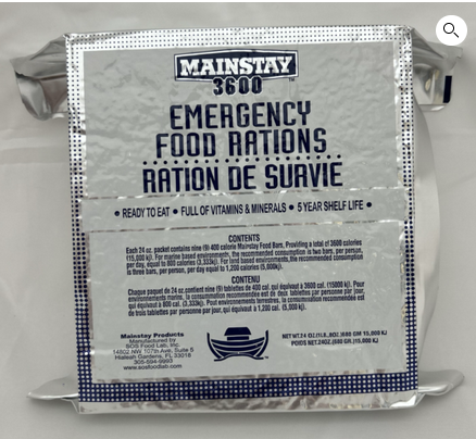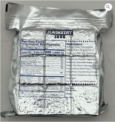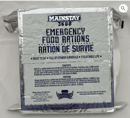 Our food ration packs are purpose designed for survival situations and produced by a specialist survival food manufacturer in the USA. This product is called Mainstay 3600 and has a 5 year shelf life. It provides 3 days of emergency food rations for one person and contains all the nutrients required for survival. We have tested this product for both taste and how it may fulfill hunger pangs if no other food is available. See the full test results at the bottom of this page.
