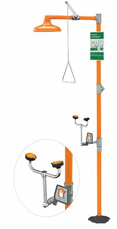 Application: Combination eye/face wash and shower safety station. Eye/face wash features two large FS-Plus spray-type outlet heads that deliver a flood of water for rinsing eyes and face. Unit is provided without a bowl or drains for wastewater. Note: Floor drain should be provided underneath the unit to prevent the accumulation of water on the floor.