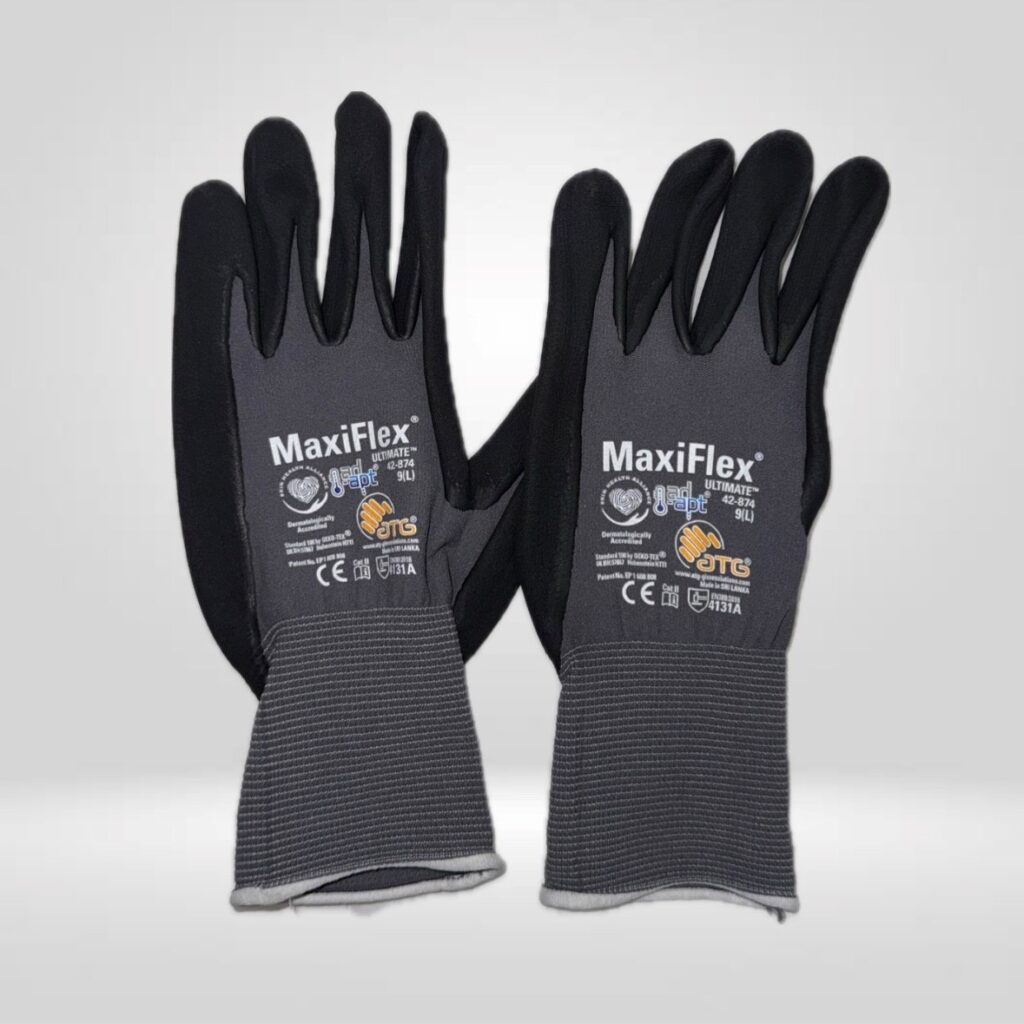 Ultimate Maxiflex gloves are the very latest in glove technology. They are designed for precision handling while providing Level 4 (out of 4) abrasion and tear resistance.<br /> The glove is made of a seamless nylon/lycra liner that stretches to fit the hand perfectly to maximise comfort, dexterity and flexibility. This glove actually breaths – using a technology called Airtech that enables 360 degree breathability thereby hands cool and dry. The liner is also nitrile/polyurethane coated applied to give superior protection and excellent grip.<br /> The coating is water resistant and nitrile is best coating for withstanding chemicals (especially petrochemicals), acids, alkalis, solvents, thinners, strong detergents etc.</p>